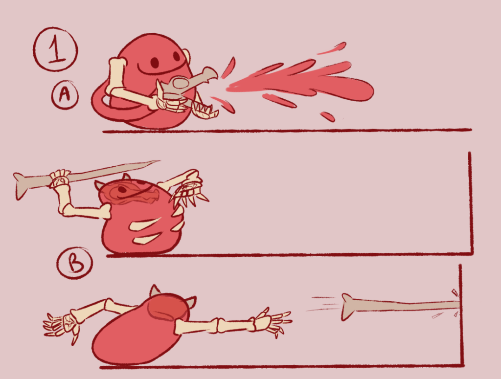 Our original idea for the character and its mechanics was poorly received by our teachers and tensions were high between the art and design team. However, after another brainstorm and more communication between the 2 teams, we settled on the idea of a demon with blood manipulation powers. From this, we came up with a gameplay loop we found satisfying.