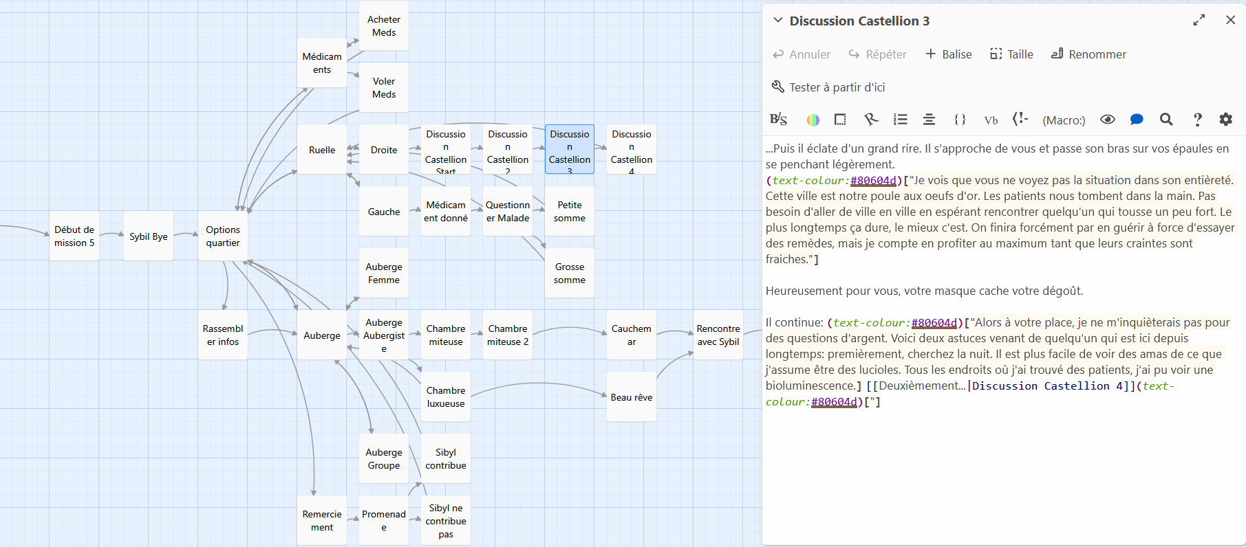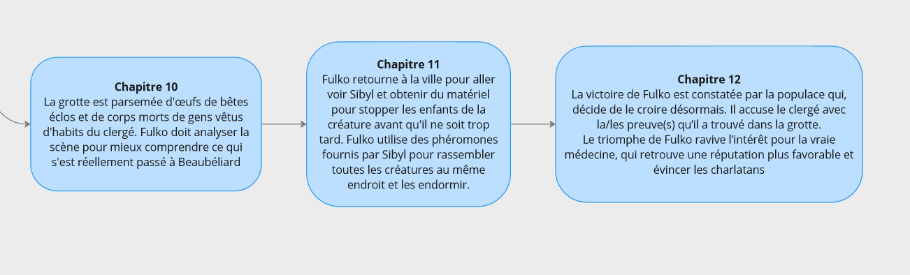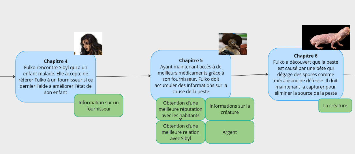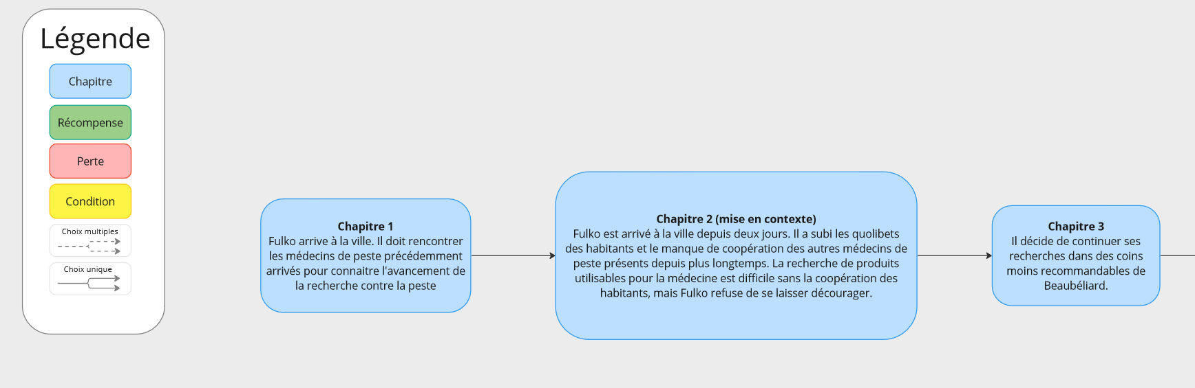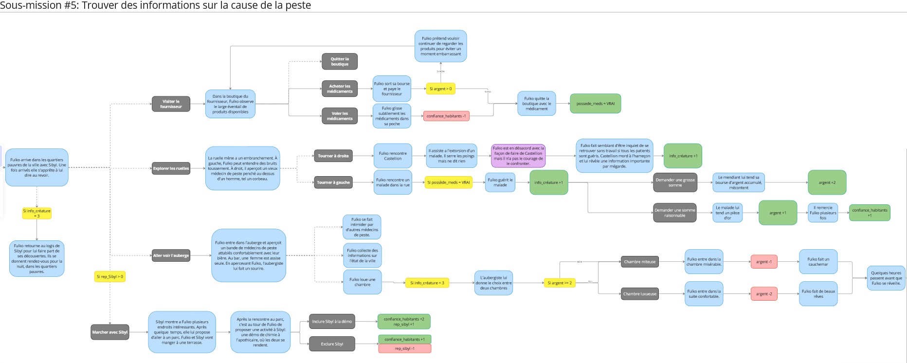 Finally, once our narrative structure was established, I started on writing the sub-flowchart I had spent the most time designing and that I had assigned to myself (chapter 5). It constituted the largest part of the story and I wanted to make sure the research of clues of plague outbreak causes was gradual, interesting and coherent.