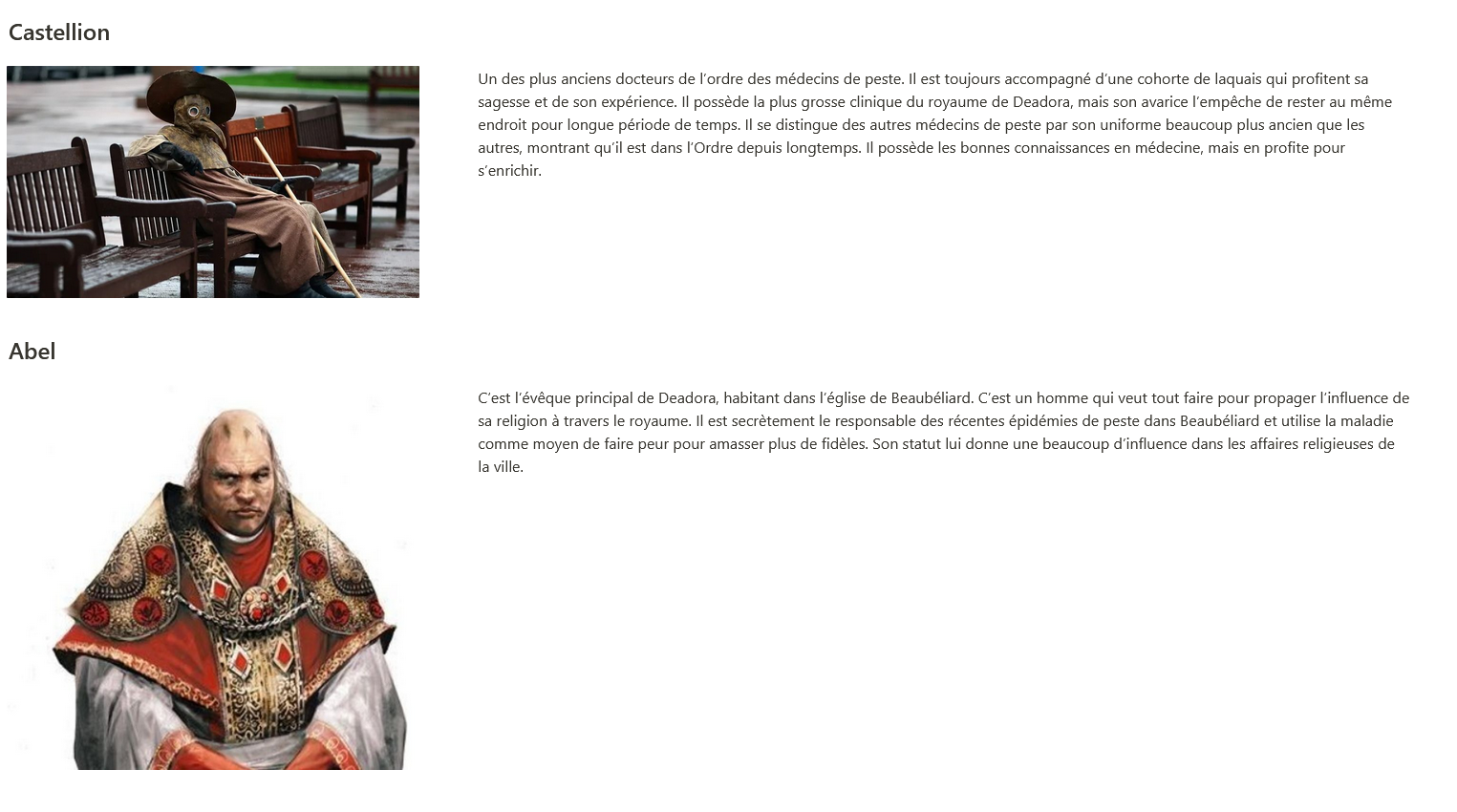 Once the bases of our world was established, I started working on the different factions. Most were planned to be antagonistic, so as to put pressure on the player and make him feel like an underdog. As such, a powerful but corrupt plague doctor organization seemed perfect. Corrupt clergymen also fit the bill, since they could claim their god was the solution to the plague.