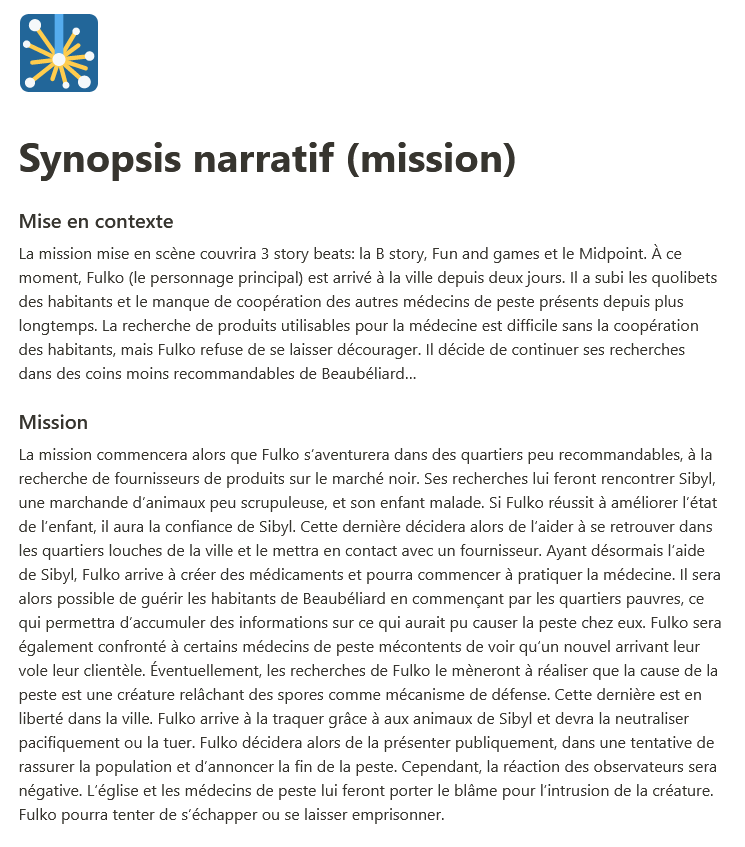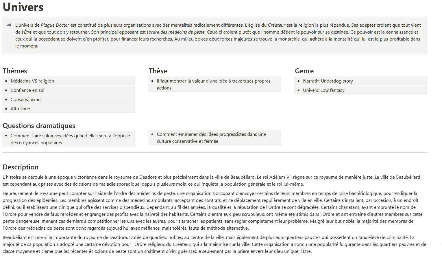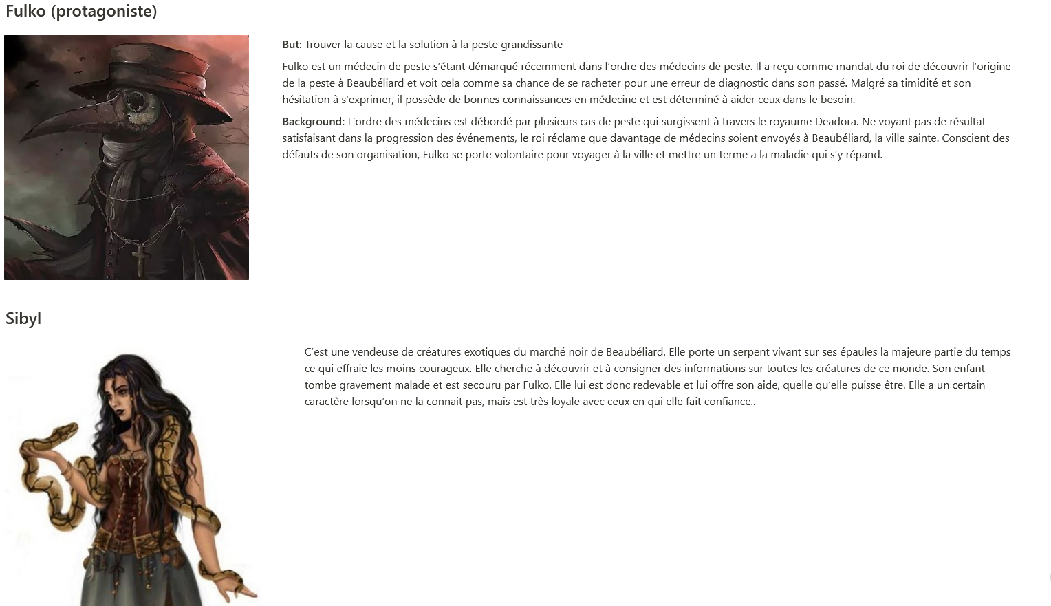 We first hesitated between 3 scenarios before settling with a half-medieval, half-renaissance setting. To start, I contributed to the story’s narrative bible, establishing locations, factions and possible characters for our story.