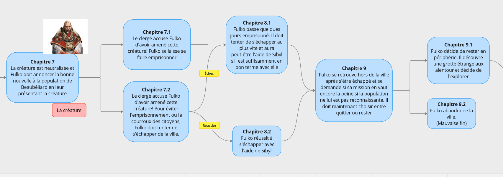 We opted to start the Twine file from act 2, since it was the one that held the most potential for player interactions. Those represented chapter 4 to 7 in our global flowchart. For each chapter, we created a sub-flowchart showing how the Twine file would progress, the variable names, which characters would be met and what the player would gain from each interaction.